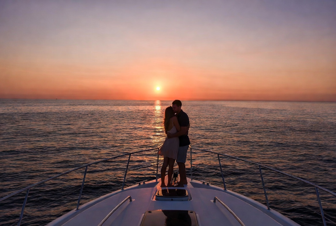 A man and woman embrace and kiss on the bow of a white yacht facing the ocean. They stand silhouetted against a vibrant orange and purple sunset with the sun reflecting on calm waters. The couple wears casual summer clothes including shorts and a dress.