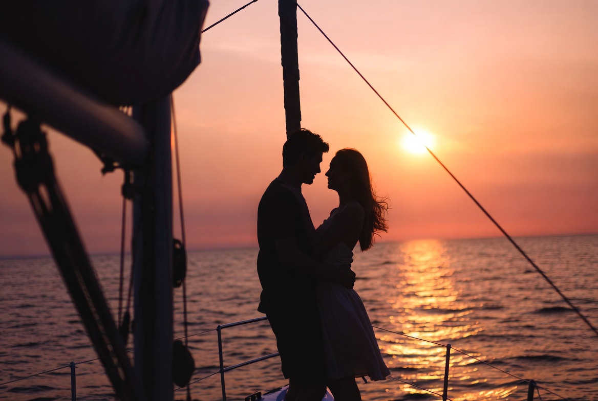 A silhouette of a man and woman stands closely embracing on the deck of a yacht during sunset. The vibrant orange sky and sun reflect on the calm ocean water behind them. Yacht rigging and sails frame the romantic scene.