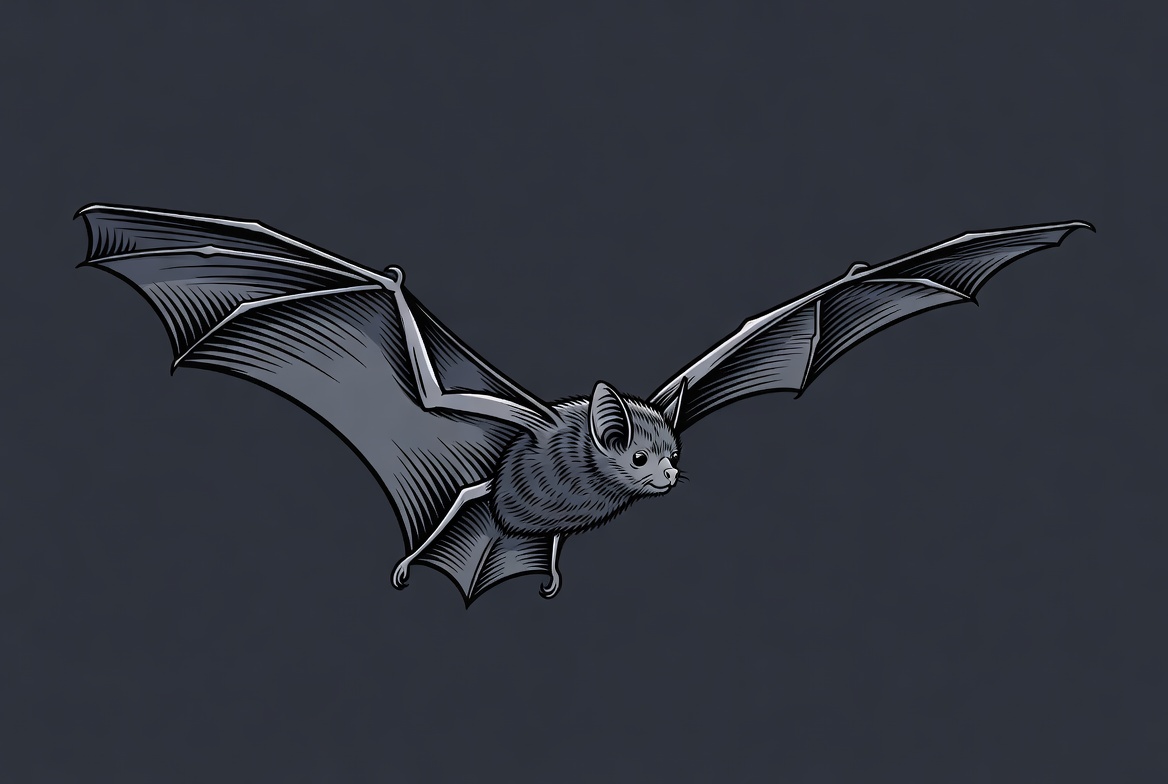 A detailed line art illustration of a bat in flight against a dark background. The bat features large spread wings, pointed ears, and a furry body with striped patterns. It is depicted in a dynamic soaring pose with intricate shading.