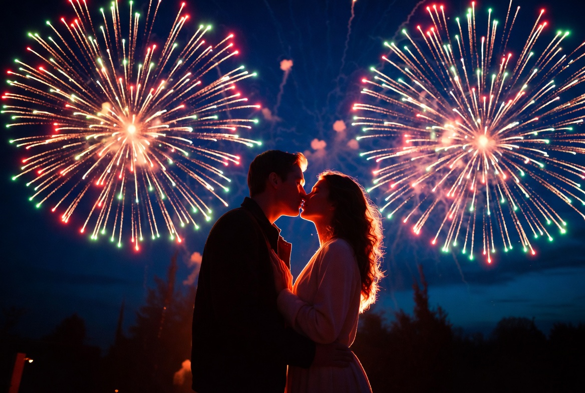 Couple kissing under fireworks