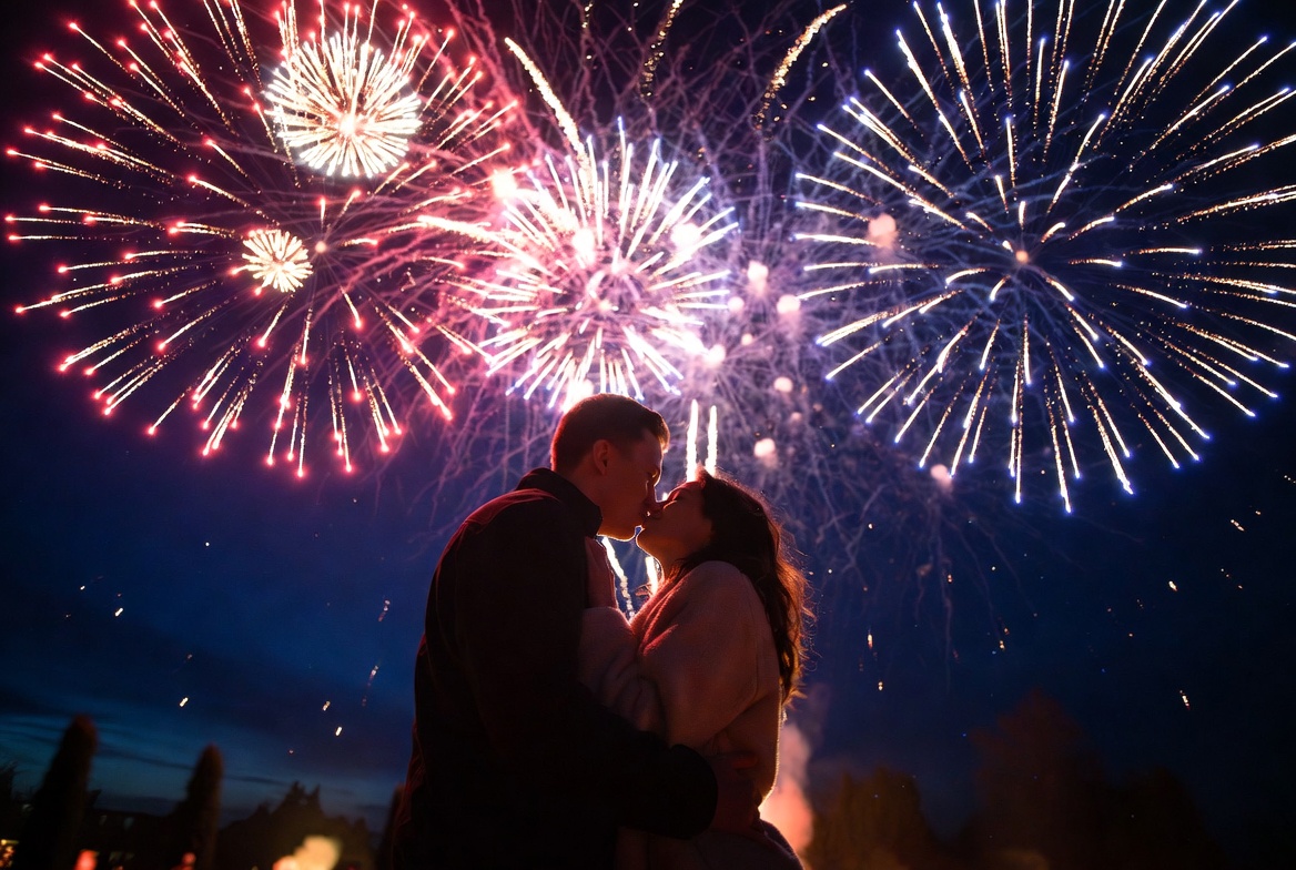 New Years, White, blue fireworks, celebration, dark coat, embrace, embrace, female, fireworks, kissing, long hair, male, man, night sky, outdoor, passionate kiss, people, red fireworks, romance, silhouette, sweater, white fireworks, woman, couple