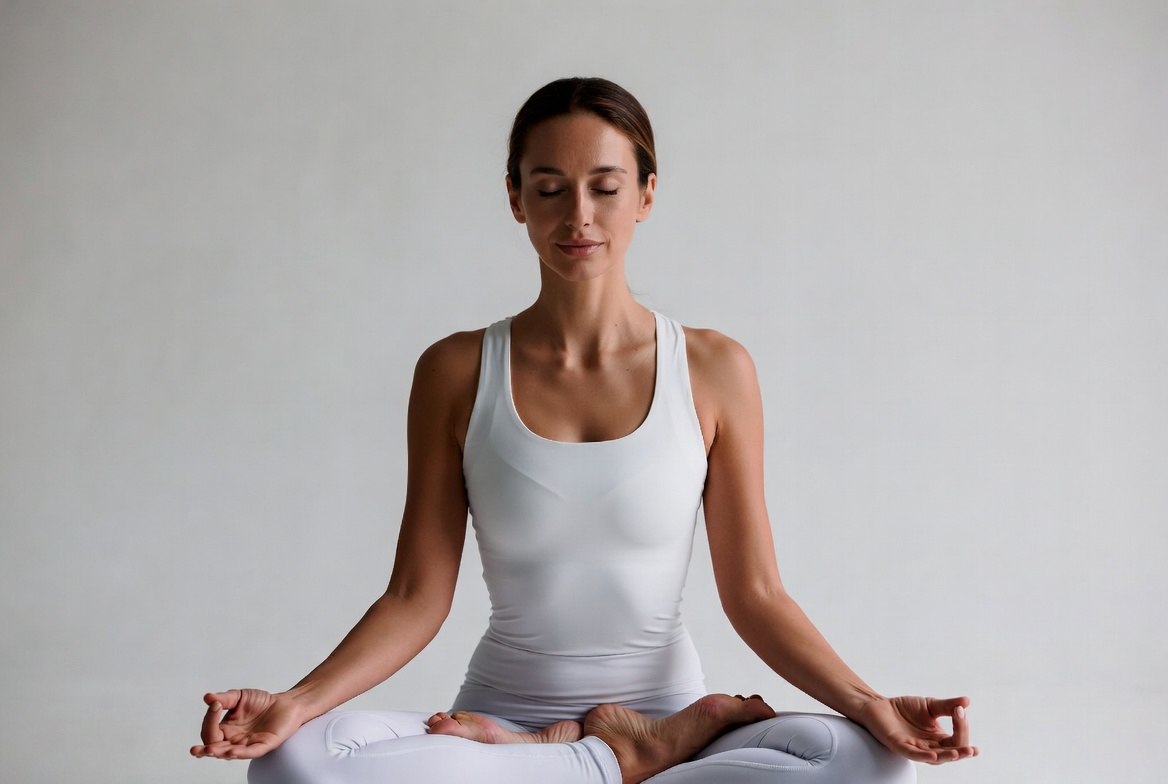 A woman with brown hair sits cross-legged in lotus pose on a white background. She wears a white tank top and leggings, with her hands in a mudra position at her lap. Her eyes are closed in a serene meditation posture.