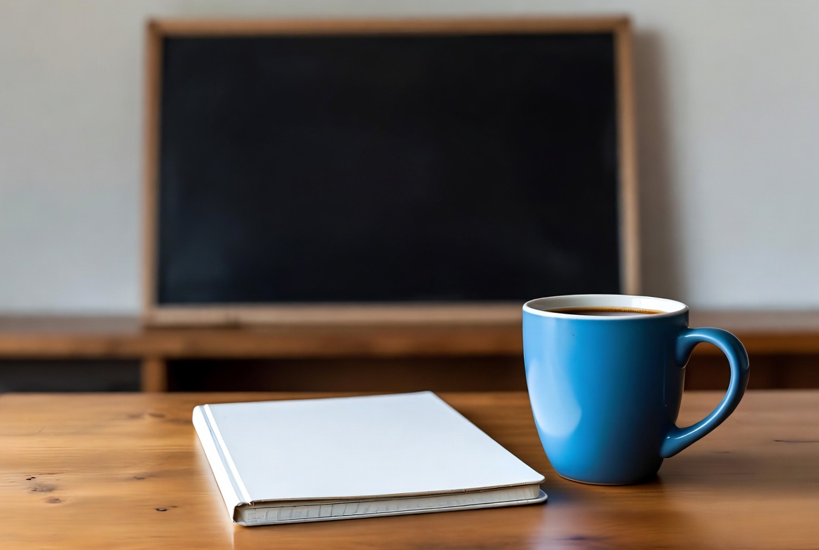 blackboard, blue mug, chalkboard, classroom, coffee, coffee cup, desk setup, isolated background, learning tools, notebook, office supplies, study desk, white notebook, wooden desk, wooden frame, coffee mug