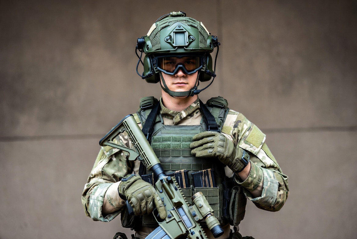 A male soldier in full tactical camouflage uniform stands confidently against a gray background. He wears a green helmet with goggles, gloves, and body armor while gripping a rifle across his chest. The gear includes multiple pouches and straps for combat readiness.