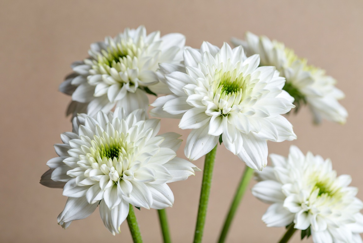 beige background, blooms, bouquet, chrysanthemum, closeup flowers, floral arrangement, flower cluster, flower stems, fresh flowers, garden flowers, green stems, isolated background, petals, white chrysanthemums, white flowers