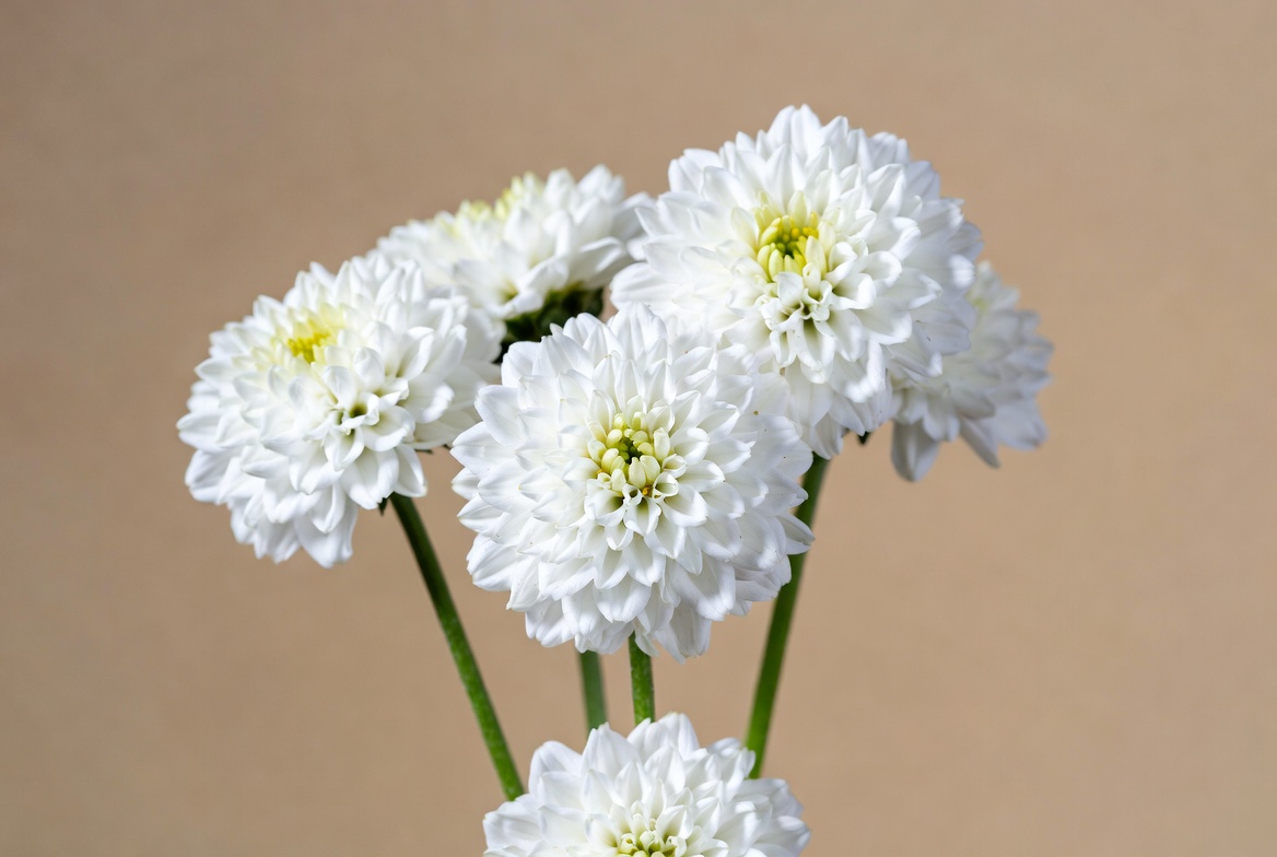 beige background, blooming flowers, bouquet, close-up flowers, dahlia bouquet, dahlia flowers, floral arrangement, flower cluster, flower photography, fresh flowers, garden flowers, green stems, pom-pom flowers, white flowers, white dahlias
