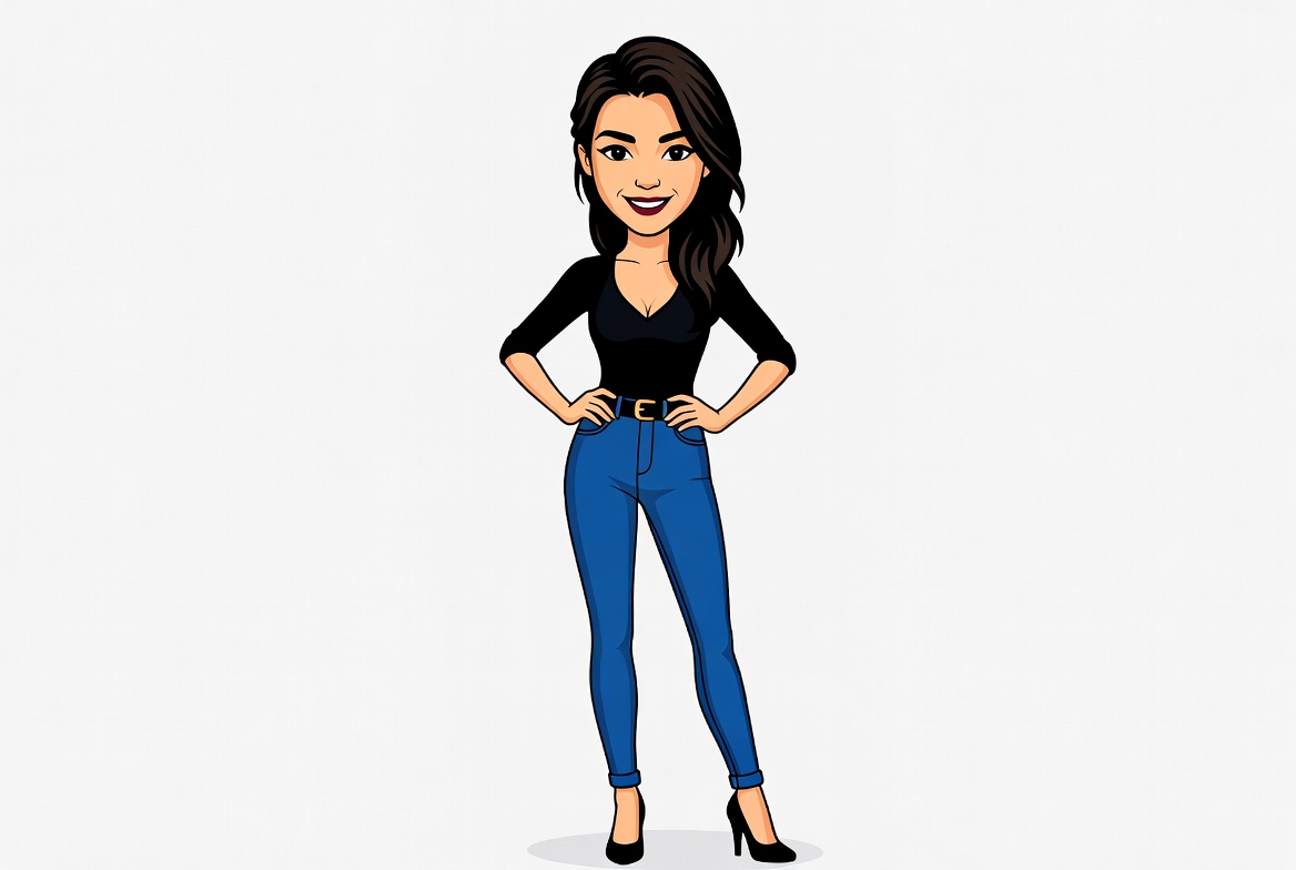 A smiling cartoon woman with long dark brown hair stands confidently with hands on hips. She wears a black long-sleeve top with a belt, tight blue jeans, and black high heels. The illustration is on a white isolated background.