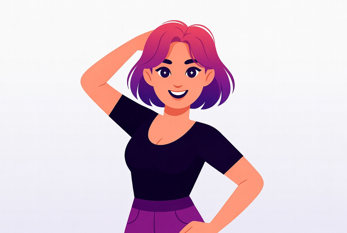 A vibrant cartoon illustration of a young woman with short pink-purple hair scratches her head with her right hand while smiling happily. She wears a black sleeveless top and purple pants, standing confidently with her left hand on her hip against a plain light blue background.