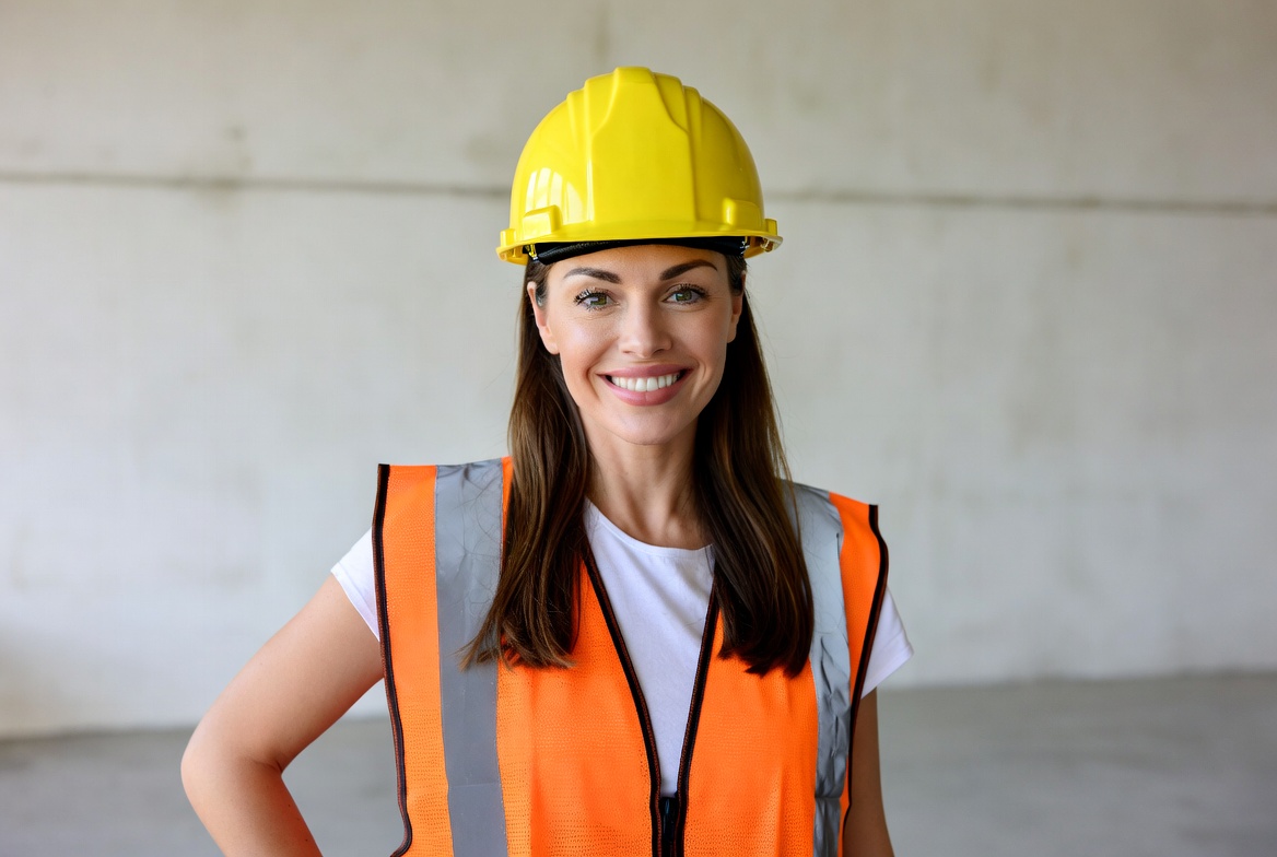 A smiling woman with long brown hair wears a yellow hard hat and orange high-visibility safety vest over a white t-shirt. She stands confidently with hands on hips in an empty industrial space with gray walls and concrete floor. Her expression is positive and professional.