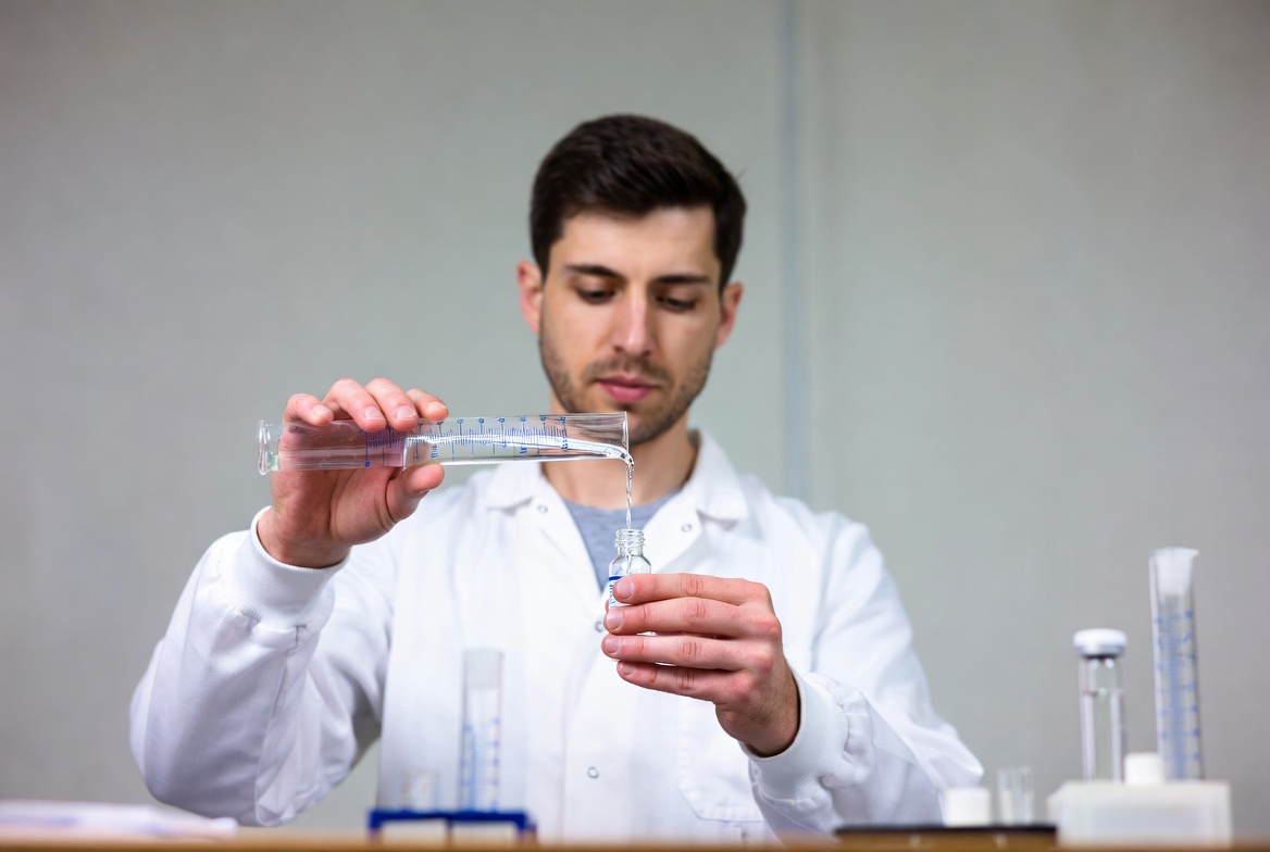 White, beakers, blue liquid, chemistry experiment, glass vial, glassware, lab bench, lab coat, laboratory, male, measuring cylinder, pouring liquid, research, science, scientist, test tubes, man