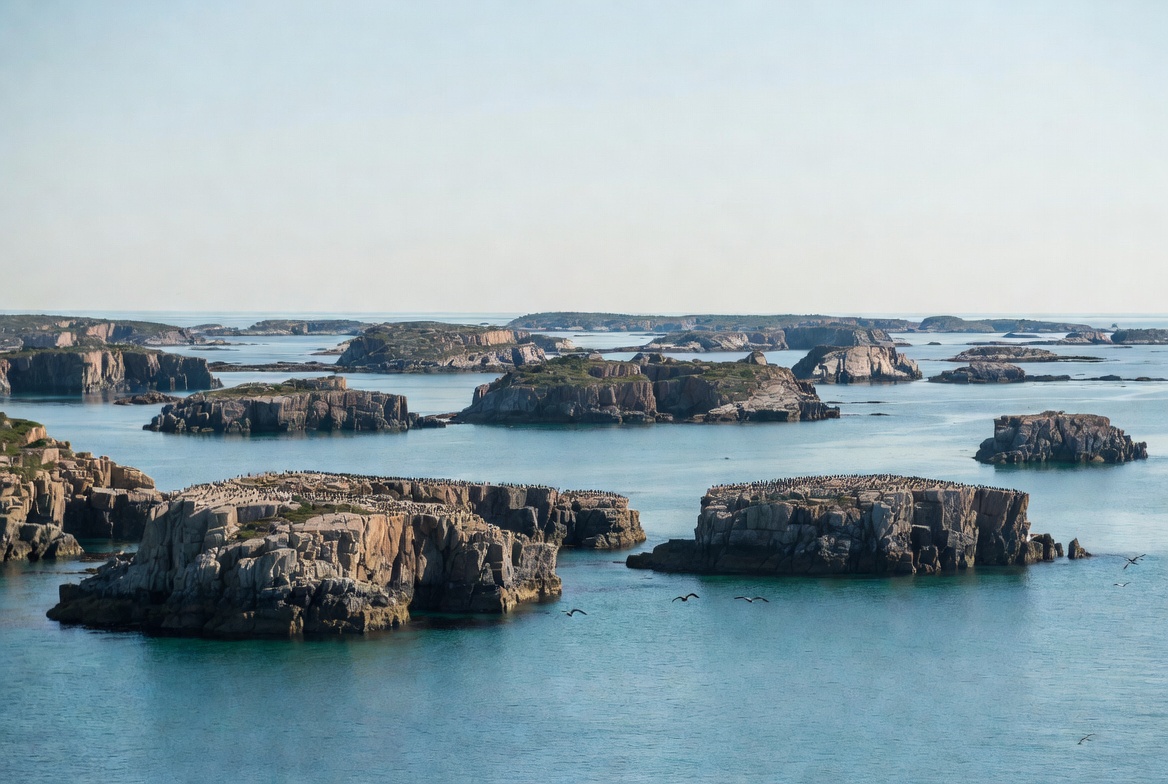 aerial view, archipelago, blue water, clear sky, cliffs, coastline, eroded rocks, green vegetation, horizon, island chain, natural beauty, nature, ocean, rock formations, rocks, sea landscape, seascape, turquoise sea, water, rocky islands