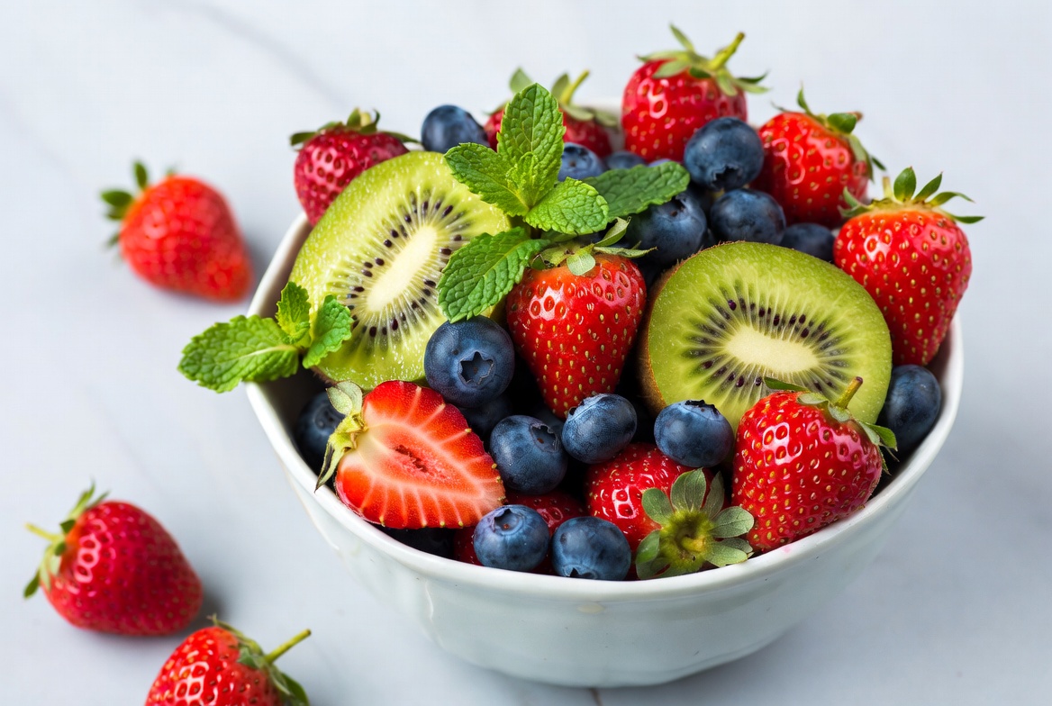 A white bowl filled with fresh strawberries, sliced kiwis, and blueberries sits on a light wooden surface. Mint leaves garnish the vibrant mixed fruit salad. Scattered berries and kiwi slices surround the bowl.