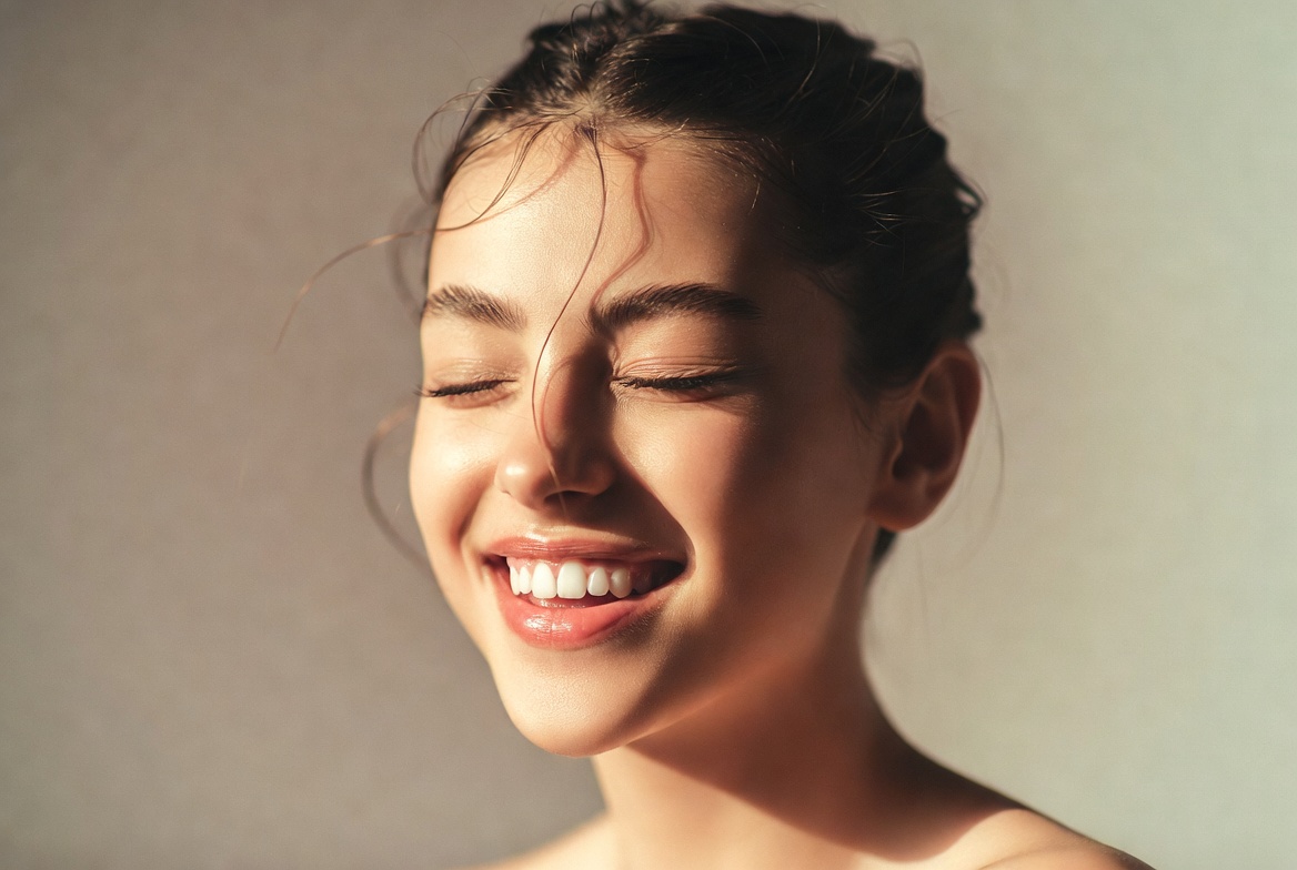 A young woman with dark hair in a bun smiles with her eyes closed, facing sunlight. Her face is softly lit with warm light highlighting her features against a plain background. She has a joyful expression with glossy lips.