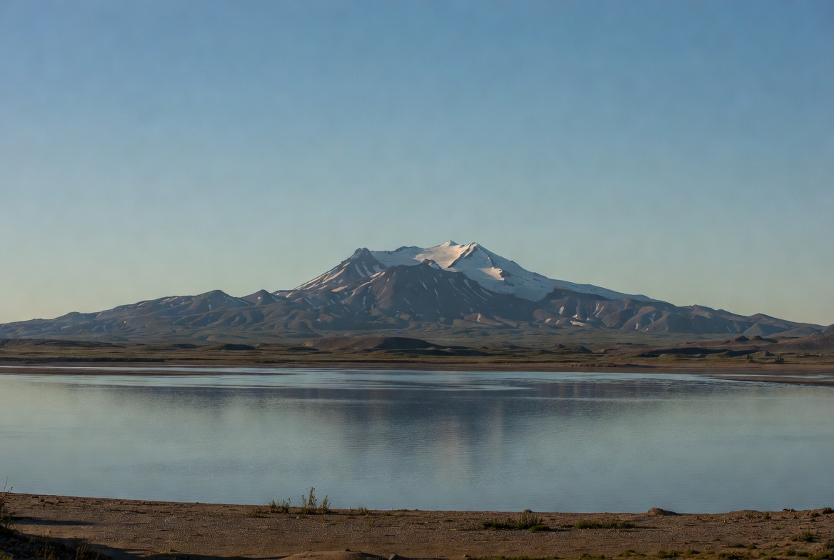 A majestic snow-capped mountain rises prominently against a clear blue sky, with its rugged peaks partially covered in white snow. The mountain's reflection is clearly visible in the calm, mirror-like waters of a lake in the foreground. Sparse vegetation and sandy terrain surround the lake base.