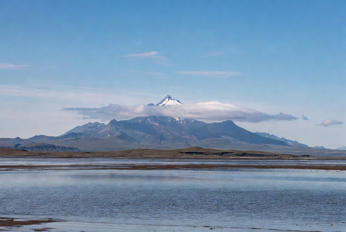 blue sky, clear water, clouds, daylight, geographical feature, green hills, horizon, icy summit, lake, landscape, majestic, nature, outdoors, peak, reflection, remote, ridges, scenery, snow-capped, travel destination, tundra, volcanic mountain, wilderness, mountain
