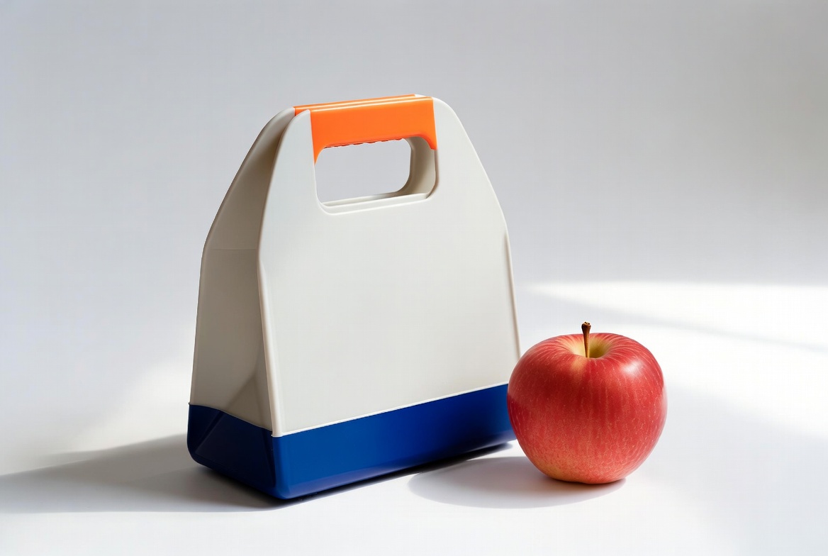 A white plastic lunch box with an orange handle and blue base sits on a plain surface. A fresh red apple is placed beside it. The items are photographed against a light gray background with soft shadows.