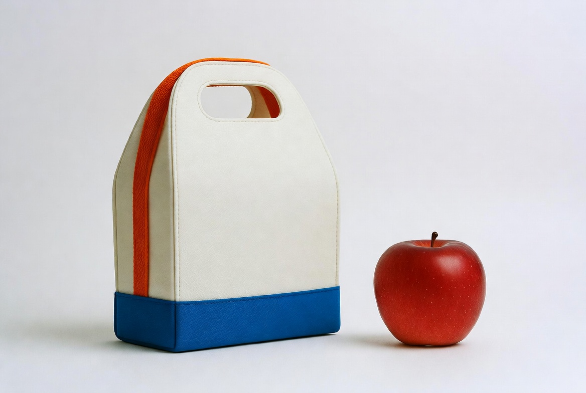apple, blue base, food container, fresh apple, isolated background, lunchbox, meal bag, orange handles, product photo, red apple, school bag, tote bag, white background, white bag, lunch bag