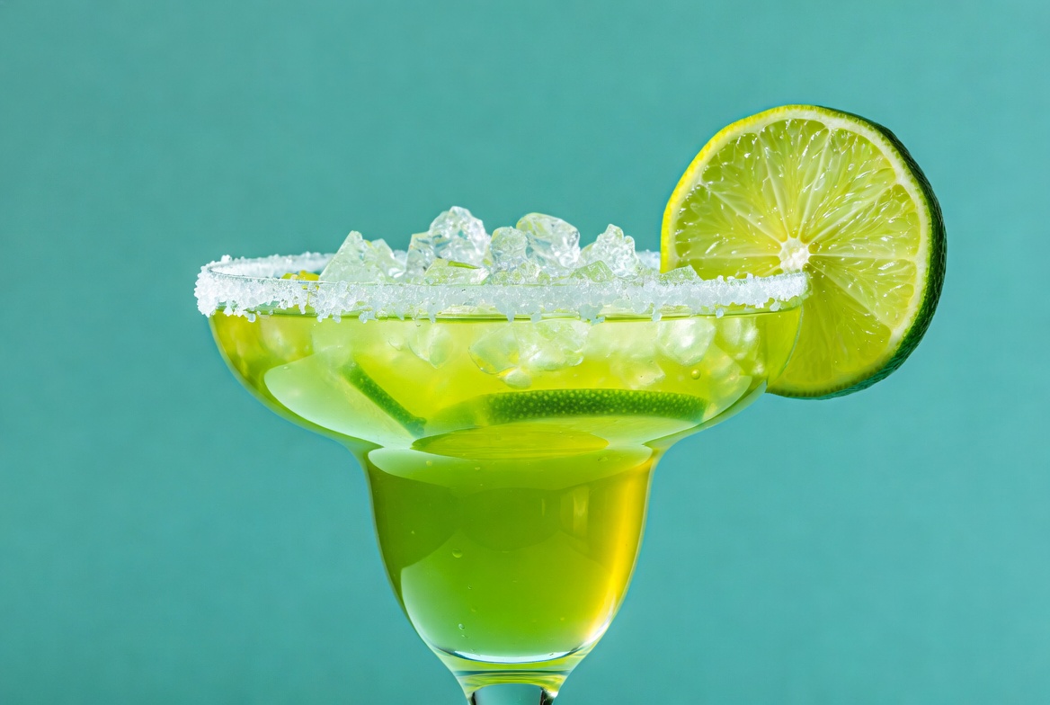 A classic margarita cocktail in a margarita glass features a salt rim and ice cubes. A fresh lime wedge is perched on the edge. The vibrant green liquid is set against a turquoise background.