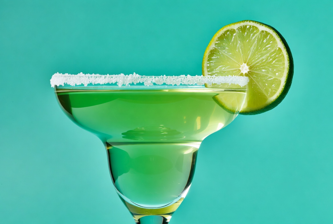 A classic margarita cocktail in a wide glass features a salted rim and a fresh lime wedge perched on the edge. The vibrant green liquid glows against a solid turquoise background. Fine white salt crystals line the glass rim.