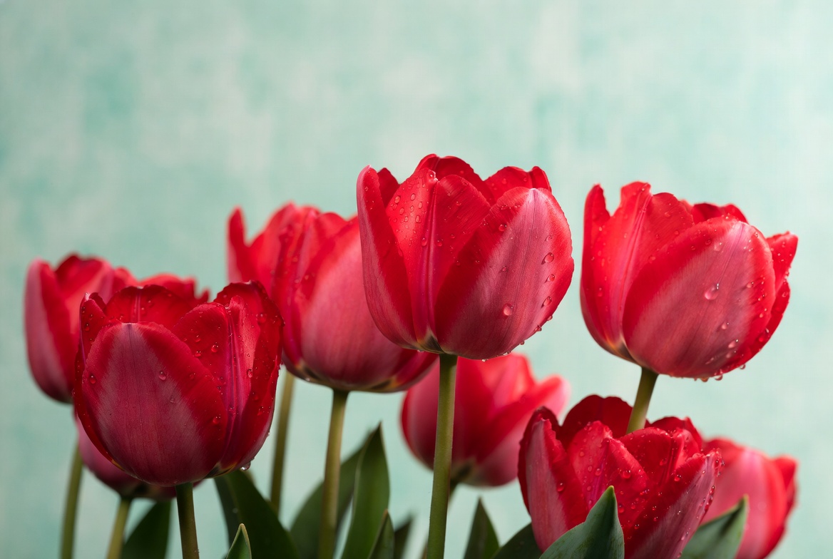 blooming tulips, close-up, dew drops, floral arrangement, flower bouquet, flower cluster, fresh flowers, garden flowers, green stems, isolated background, leaves, nature, petals, red flowers, spring flowers, teal background, tulips, vibrant red, water droplets, red tulips