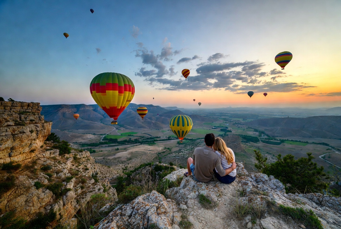 A man and woman sit embracing on a rocky cliff edge overlooking a valley at sunset. Colorful hot air balloons float in the sky above green fields and distant mountains. The scene features a vibrant sky with scattered clouds during golden hour.