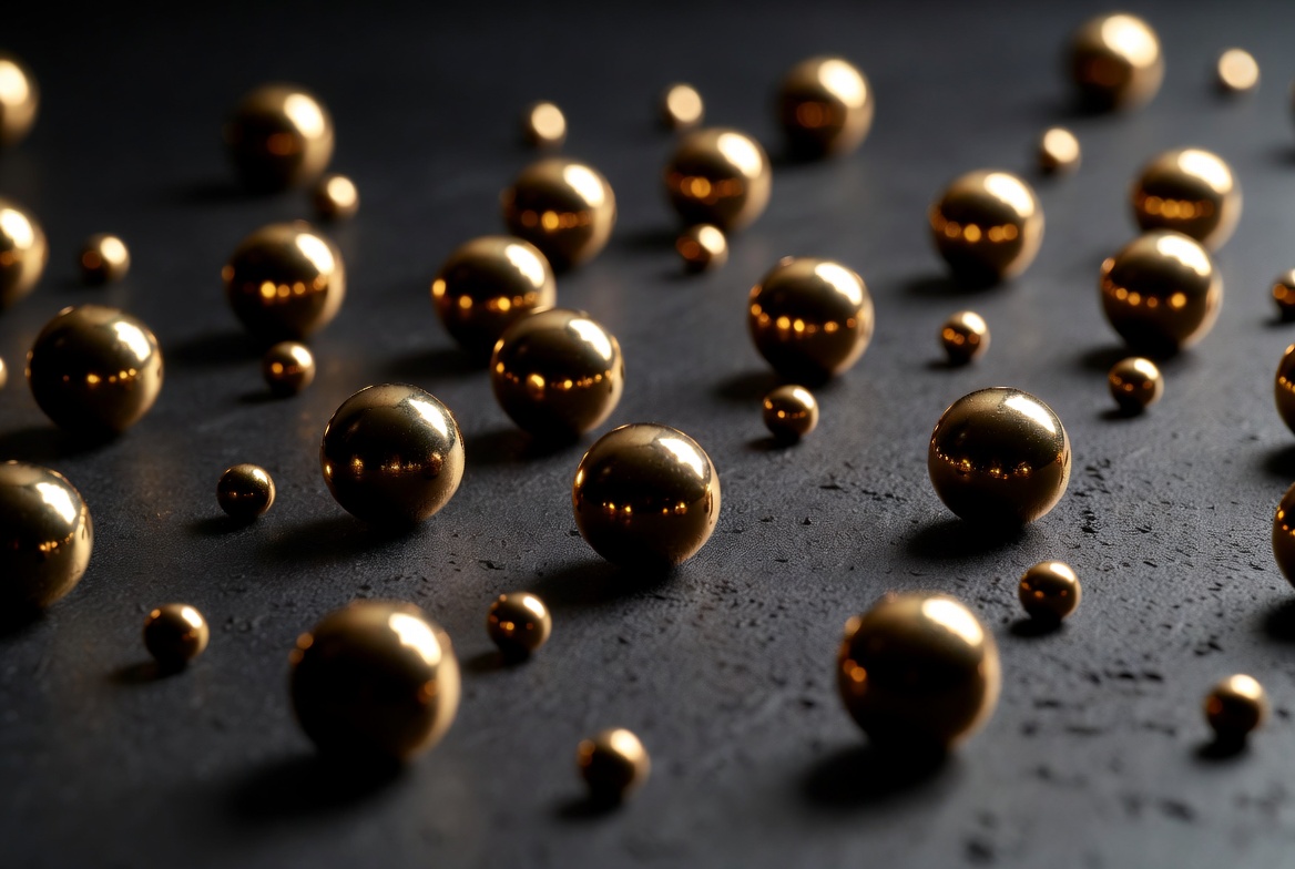 abstract balls, black background, clustered spheres, dark surface, glossy surface, gold color, gold marbles, gold spheres, golden orbs, large balls, light reflections, luxury texture, macro photography, metallic shine, metallic spheres, polished metal, product photography, reflective balls, scattered balls, shiny balls, small balls, spherical objects, steel balls, textured background, gold balls