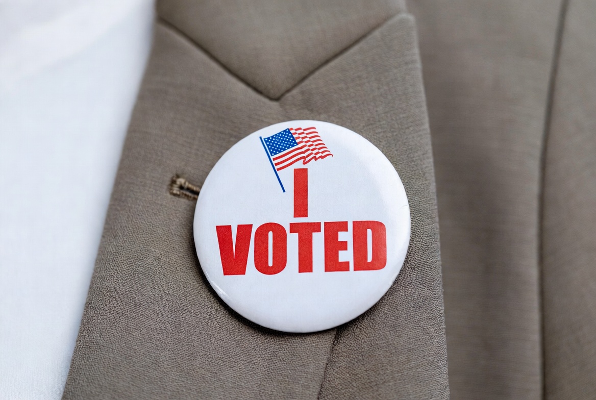 American flag, USA flag, badge, button, campaign, democracy, election, election day, formal wear, gray suit, lapel, patriotic, pin, politics, red text, suit jacket, vote sticker, voting, white button, I Voted
