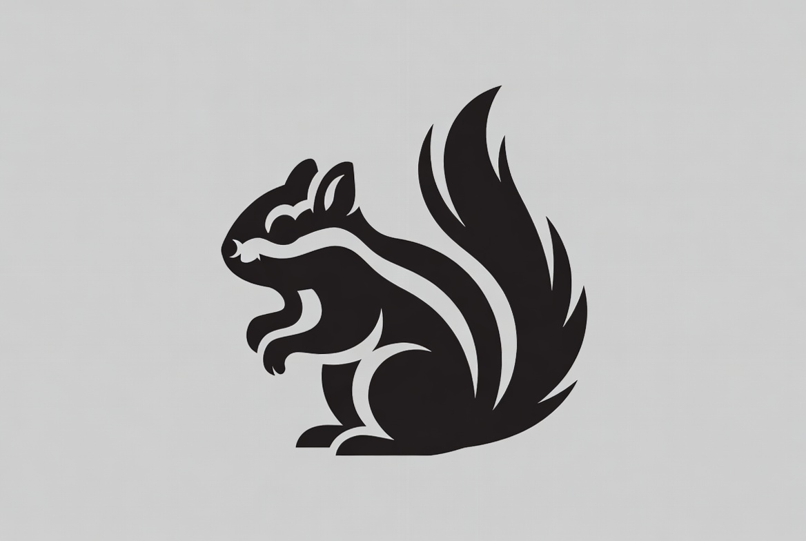 A black silhouette illustration of a chipmunk stands on a light gray background. The design features bold outlines with white stripes on the body and a large bushy tail. It is depicted in a side profile, facing right with detailed paws and facial features.