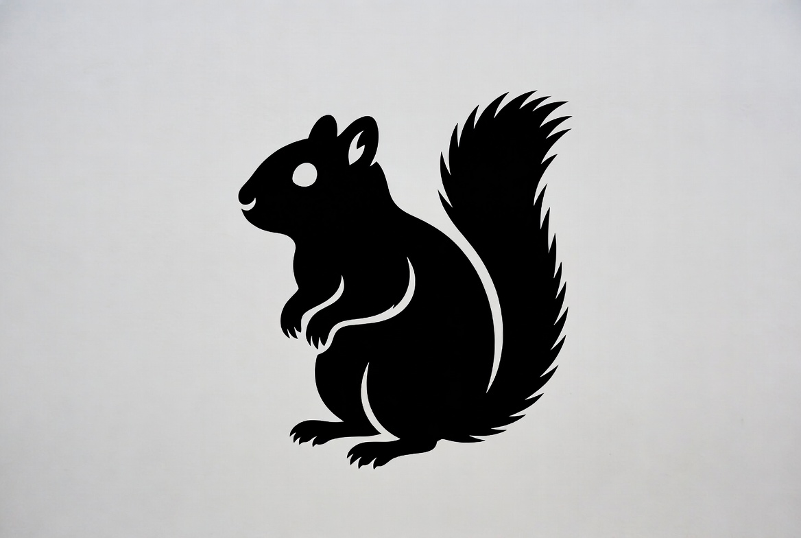 A black silhouette illustration of a squirrel stands on a plain gray background. The squirrel faces left with a bushy tail curved upward and detailed paws. It features a simple cutout style with white interior outlines.