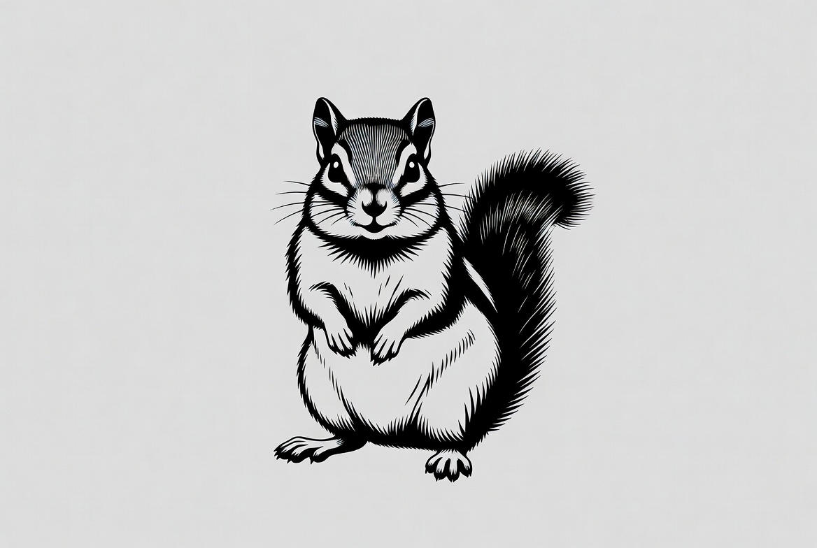 animal, big eyes, black and white, cartoon animal, clipart, cute chipmunk, fluffy tail, illustration, isolated background, line art, standing chipmunk, striped fur, vector chipmunk, chipmunk