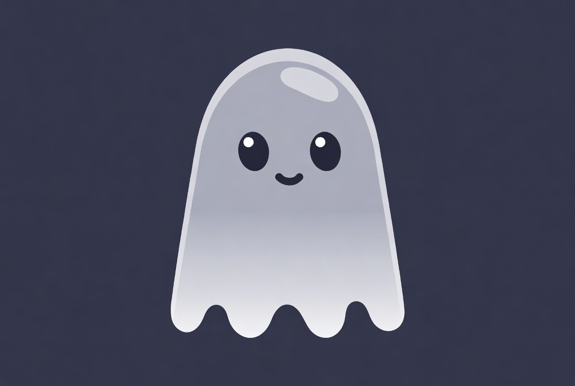A cute cartoon ghost with a shiny translucent body floats against a dark blue background. It features large round eyes and a cheerful smile. The ghost has a gradient gray design with wavy bottom edges.
