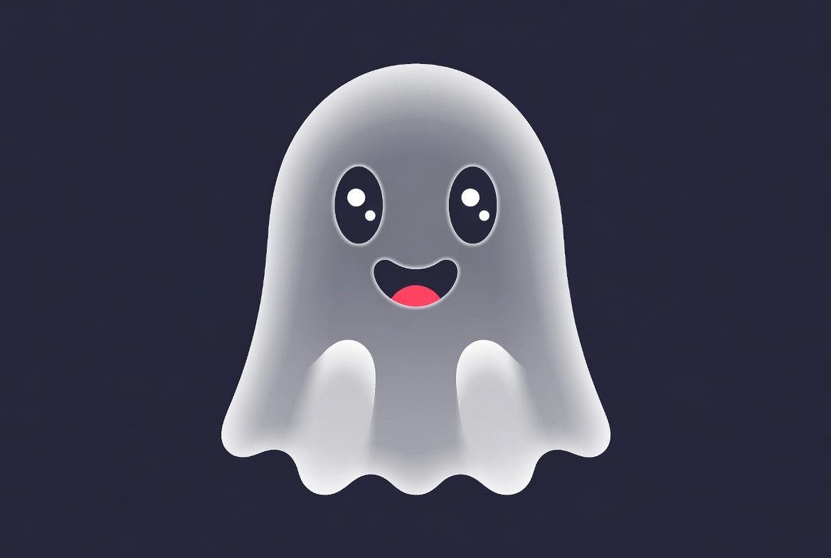 A cute cartoon ghost with large sparkling eyes and a wide pink smile floats against a dark blue background. The ghost has a translucent white body with soft glowing edges and puffy arms. It is rendered in a playful, modern illustration style.