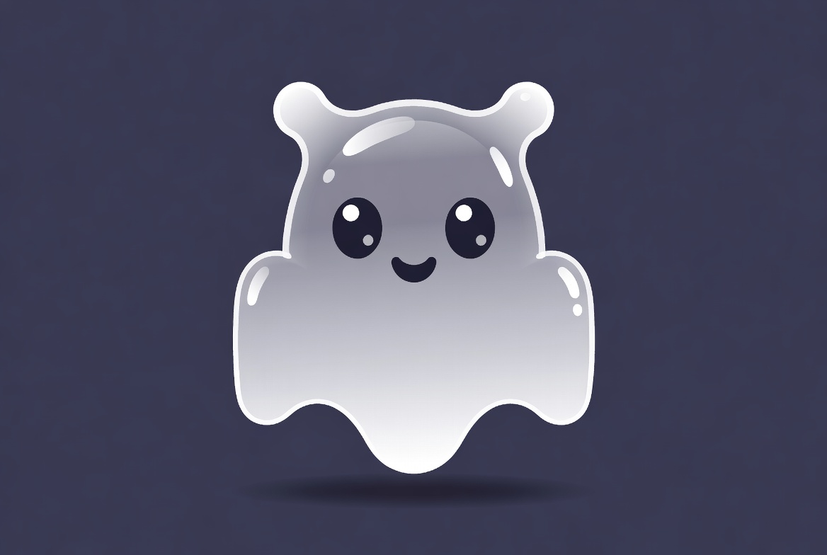 A shiny translucent white ghost with big sparkling eyes and a cheerful smile floats against a dark blue background. The ghost features glossy jelly-like texture, small rounded ears, and wavy bottom edges. It is a vibrant digital illustration in kawaii style.
