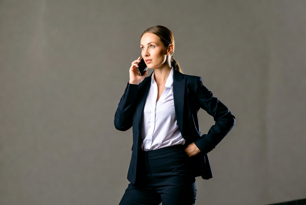 A young White woman with brown hair in a ponytail stands confidently in a dark business suit and white blouse. She holds a smartphone to her ear with one hand while the other rests on her hip. The image features a plain gray background.