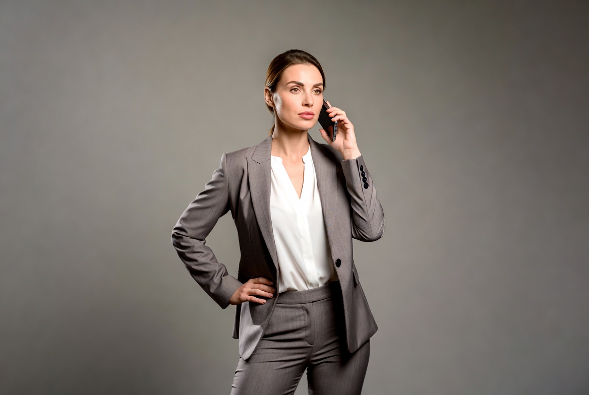 A woman with brunette hair in a ponytail stands confidently in a gray business suit consisting of a blazer, white blouse, and matching pants. She holds a smartphone to her ear with her right hand while her left hand rests on her hip. The image features a plain gray background.