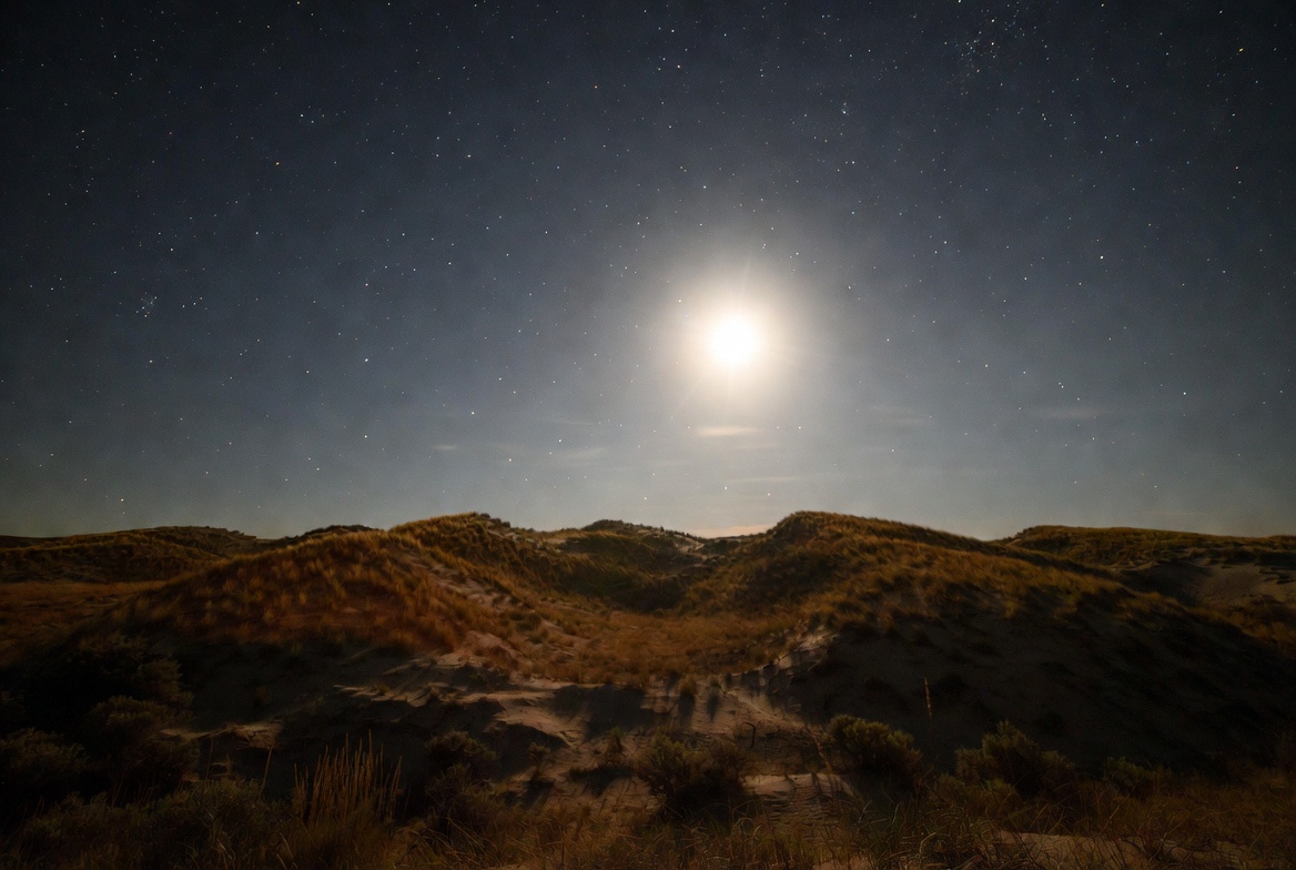 bright moon, clear sky, desert, dunes, full moon, grass, grass tufts, horizon, landscape, nature, night, night sky, outdoor, rolling hills, sand, sandy dunes, scenery, starry sky, stars, moon