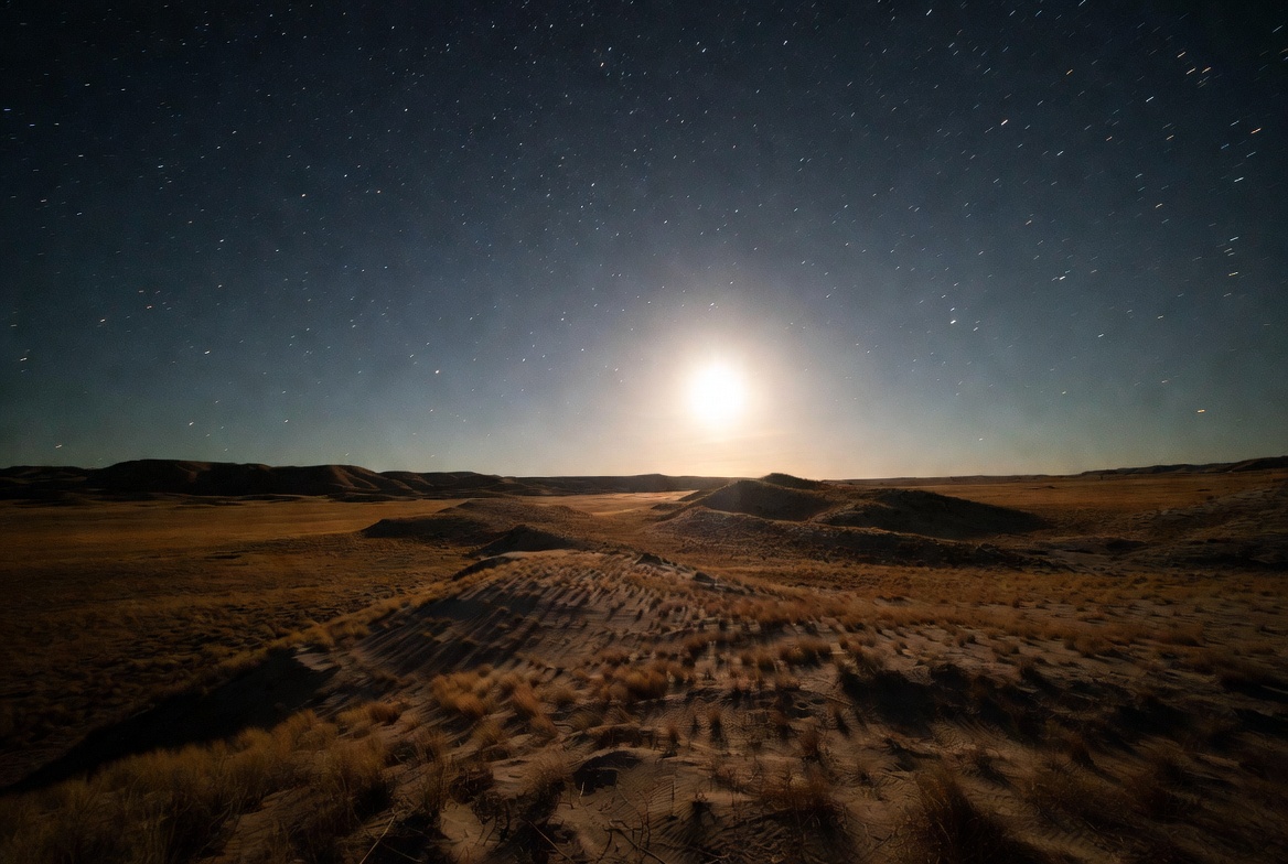 arid terrain, celestial, desert, eroded hills, golden grass, grasslands, hills, horizon, landscape, lunar, moon, nature, night, night sky, outdoor, scenery, starry sky, stars, wilderness, full moon