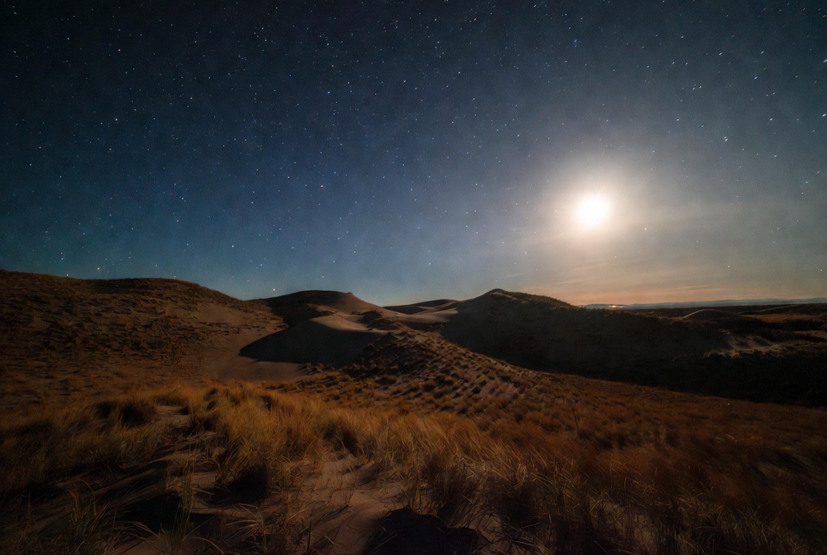 arid landscape, brown grass, celestial, dark sky, desert, desert night, dunes, full moon, grass, horizon, landscape, moon, moonlight, moonlit dunes, nature, night landscape, night sky, outdoor, rolling dunes, starry sky, stars, wilderness, sand dunes