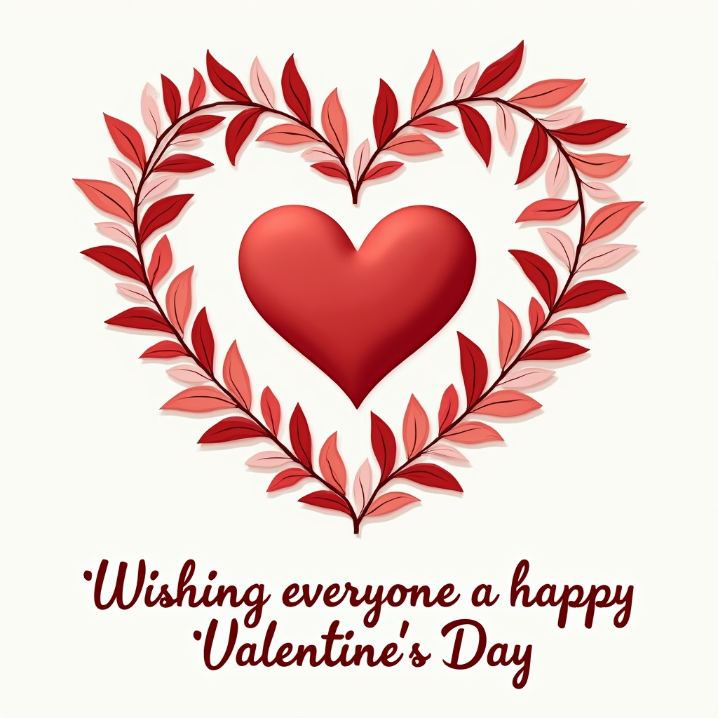 A vibrant red 3D heart is framed by pink and red leaves on a white background. The text 'Wishing everyone a happy Valentine's Day' is written below in elegant script. The design features a wreath-like arrangement of leaves surrounding the glossy heart.