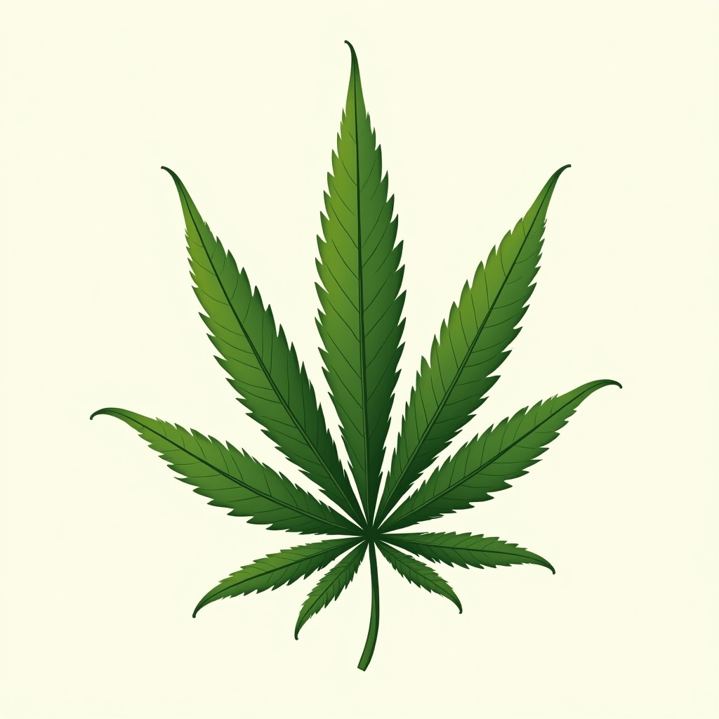 A vibrant green cannabis leaf is illustrated with detailed serrated edges and pointed leaflets. It stands prominently against a plain white background. The vector-style drawing features a central stem with five symmetrical leaves.