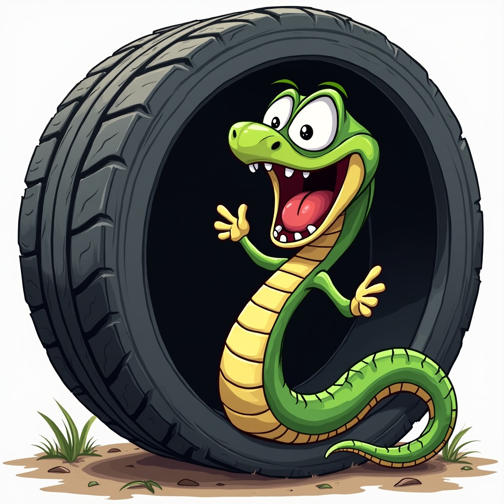 Cartoon snake popping from tire