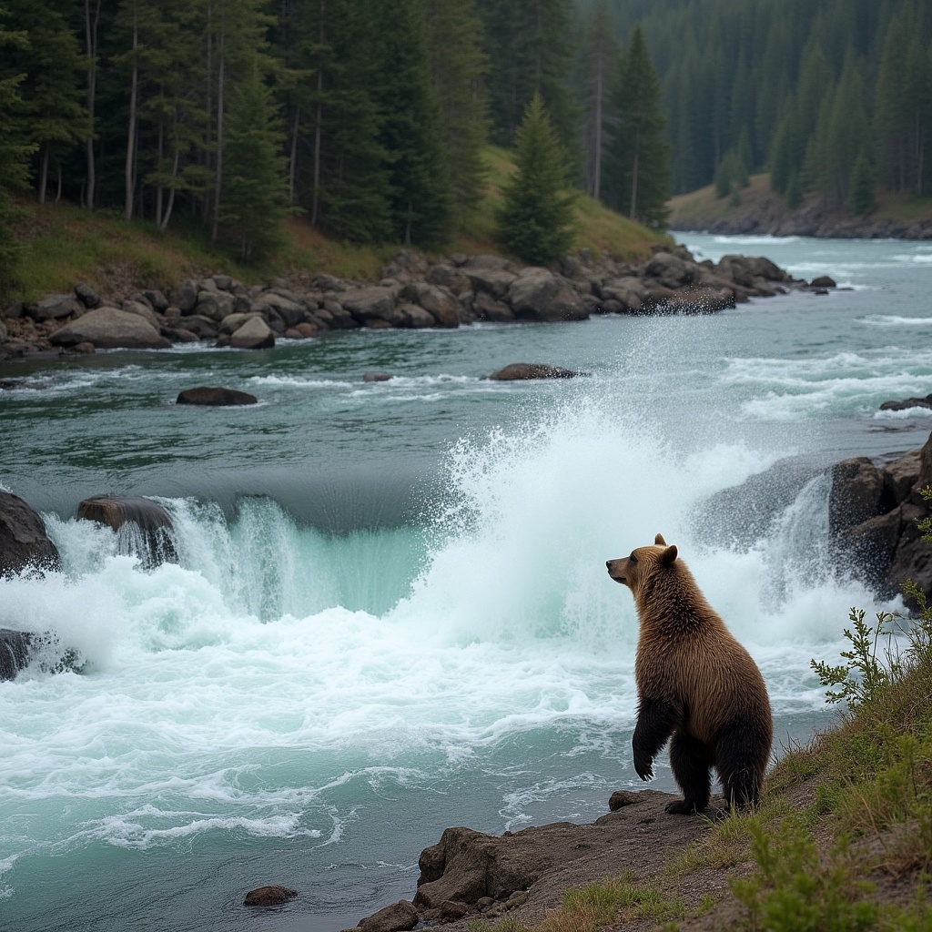 A grizzly bear stands on rocky ground near a turbulent river with splashing whitewater. Tall evergreen trees line the forested banks on both sides. The scene features clear, flowing water and scattered boulders.
