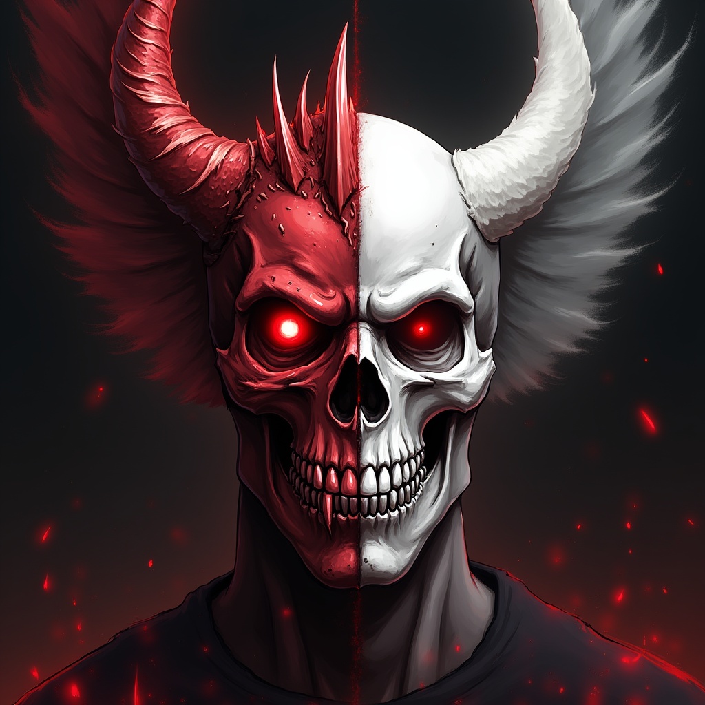 A digital illustration features a demonic skull split down the middle with a fiery red half and a pale white half. The red side has curved horns, spikes, and glowing red eyes, while the white side has angelic wings and a smooth skull. Flames and embers surround the dark background.