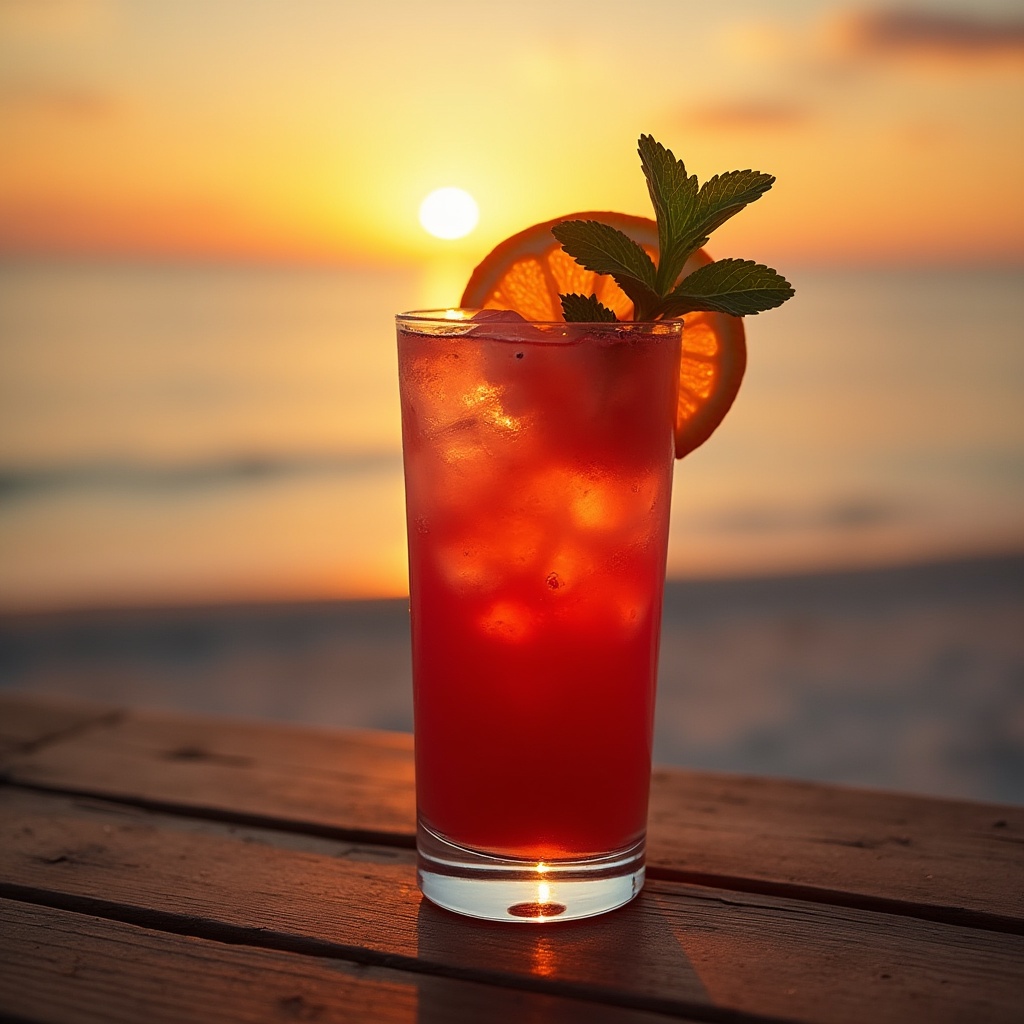 A tall glass of red cocktail garnished with orange slice and mint sits on a wooden table. The vibrant sunset sky and calm ocean horizon create a tropical backdrop. Ice cubes and fresh mint leaves add to the refreshing appearance.