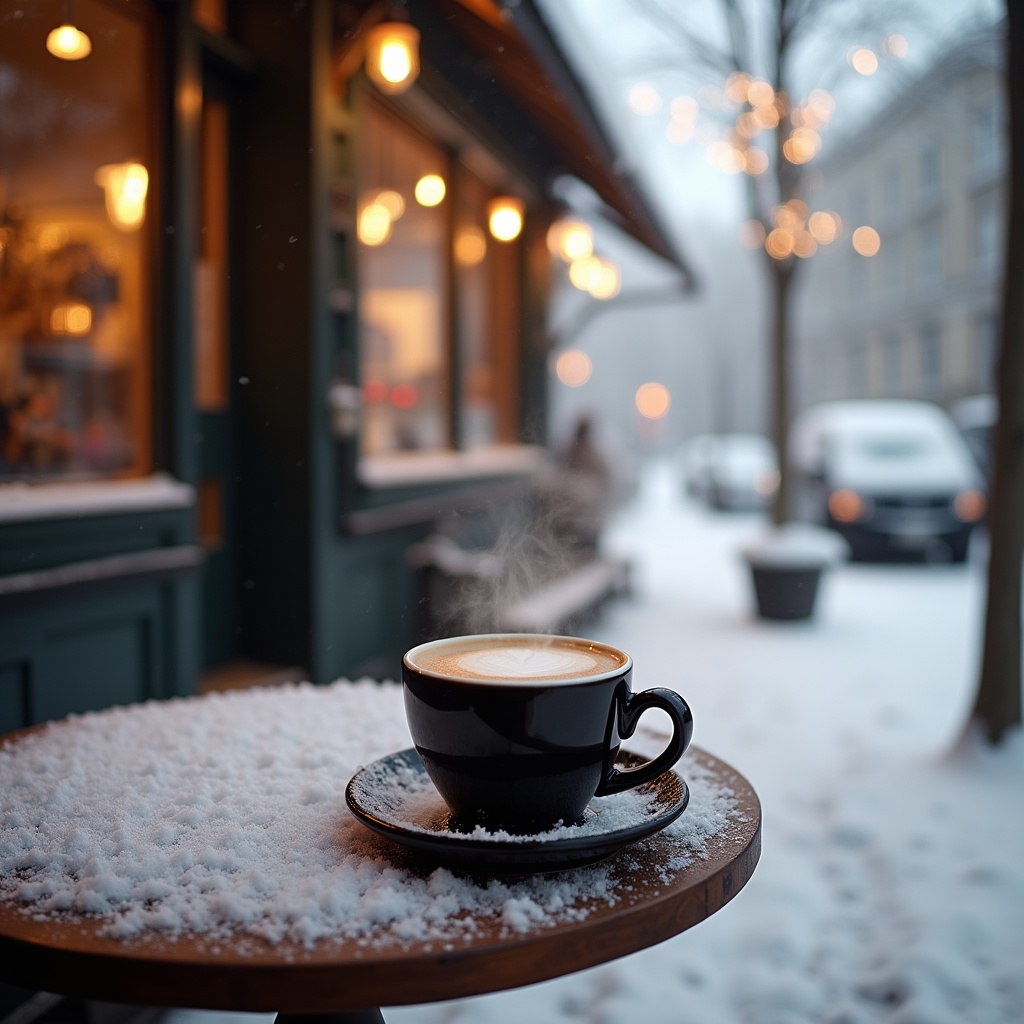 Steaming Latte on Snowy Outdoor Table