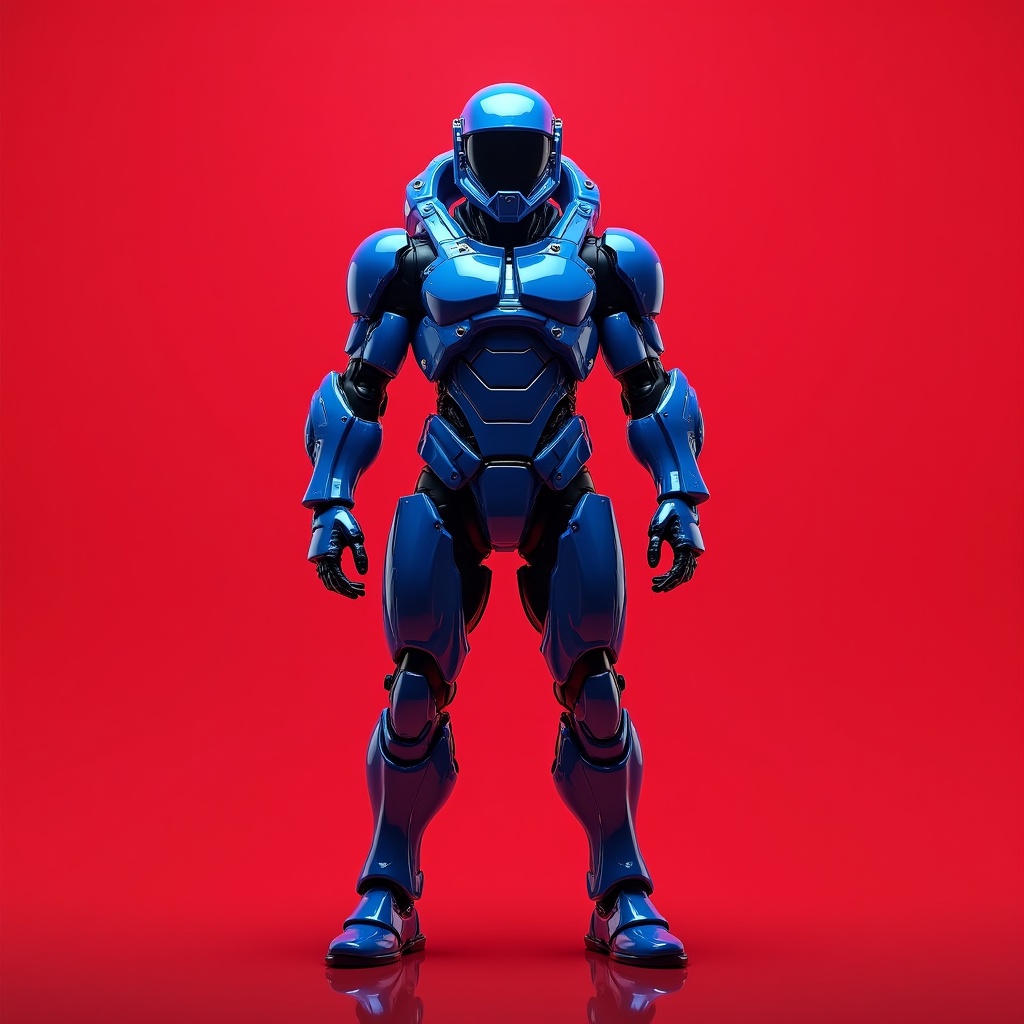 A blue futuristic armored soldier stands in a powerful pose against a solid red background. The armor features detailed metallic panels, glowing accents, and robust shoulder guards. A subtle reflection appears on the floor beneath the figure.