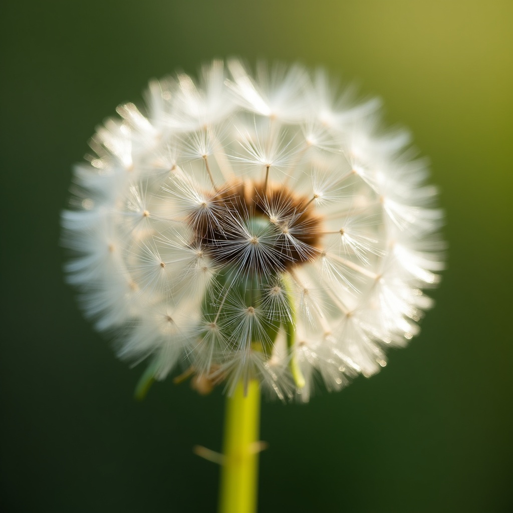 bokeh, brown center, dandelion closeup, dandelion seeds, flower, fluffy dandelion, green background, green stem, isolated background, macro photography, nature, plant, seed head, white dandelion, wildflower, dandelion