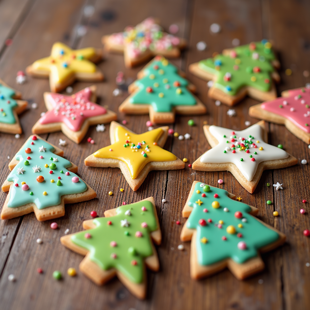 Assortment of festive Christmas cookies shaped like stars and trees, decorated with colorful icing and sprinkles. The cookies feature vibrant greens, yellows, pinks, and whites on a wooden surface. Scattered sprinkles and crumbs add texture around the arranged baked goods.