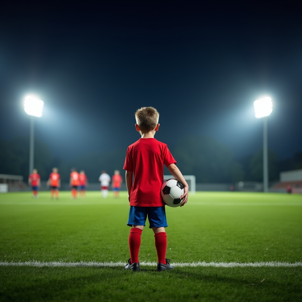 A young boy in a red soccer jersey and blue shorts stands on a green soccer field at night, holding a black and white soccer ball. He faces away toward the goal with blurred teammates in red and white jerseys visible in the distance. Bright stadium floodlights illuminate the scene against a dark sky.