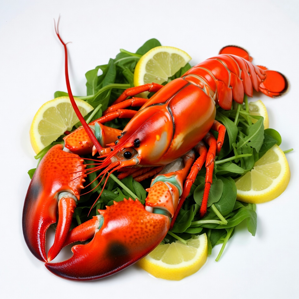 arugula, claws, food photography, fresh herbs, fresh lobster, gourmet seafood, green leaves, isolated background, lemon garnish, lemon slices, red lobster, seafood, shell, white background, lobster